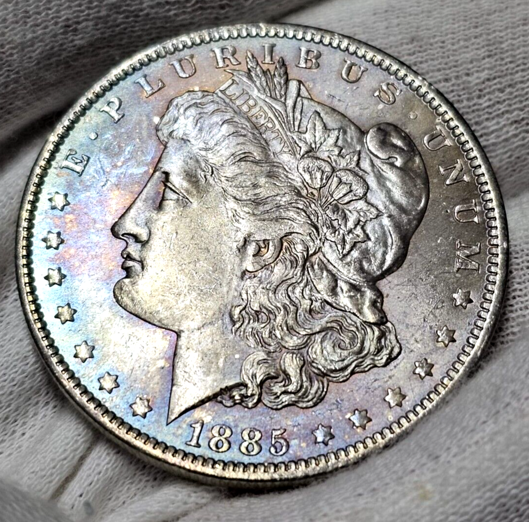 - The 1885 Morgan Silver Dollar is a striking addition to any coin collection, boasting a beautifully toned appearance that adds a touch of uniqueness to its overall charm.